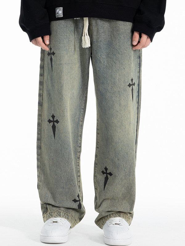 Men’s Distressed Cross Print Drawstring Straight Leg Pants