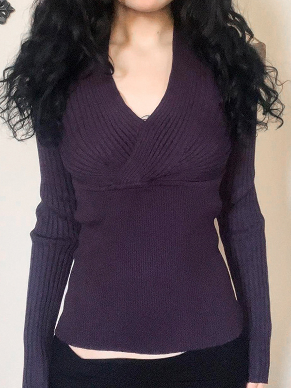 Ribbed V Neck Slim Long Sleeve Knit