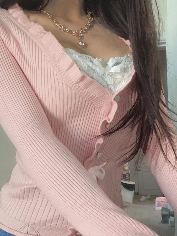 Lace Splice Tie Up Fake Two Piece Long Sleeve Knit