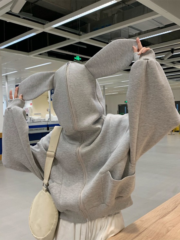 Anti Pilling Bunny Ears Zip-Up Cropped Hoodie