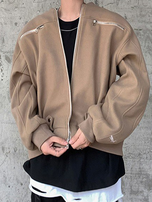 Vintage Solid Star Badge Lapel Neck Zip Up Jacket
