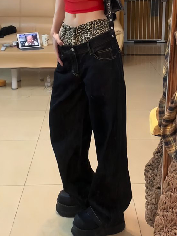 American Retro Leopard Print Stitching Boyfriend Jeans