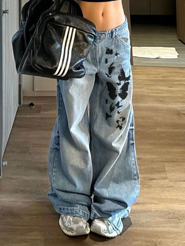 Butterfly Printed Low-Rise Boyfriend Jeans