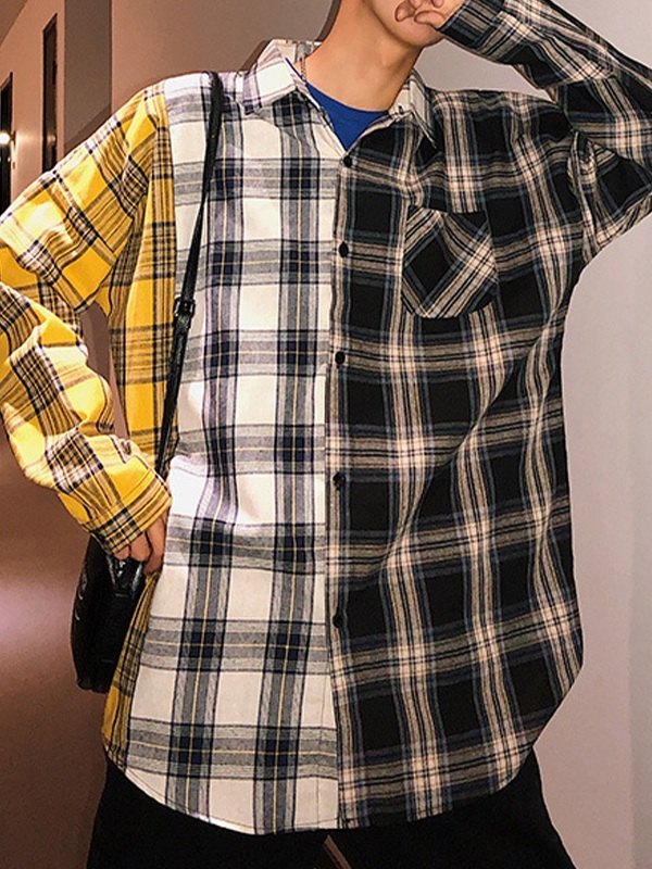 Men’s Color Block Checkered Long Sleeve Shirt