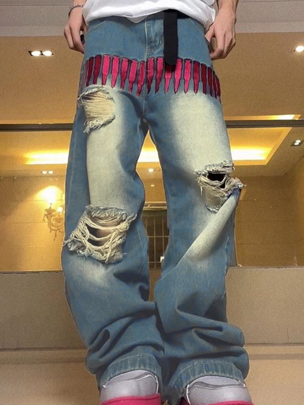Description: These classic, retro mens denim jeans are staple and versatile toStyle. They have spray tie-dye effects to the leg, with multi belt loops, functional jeans pockets and fastened a metal button zip design.