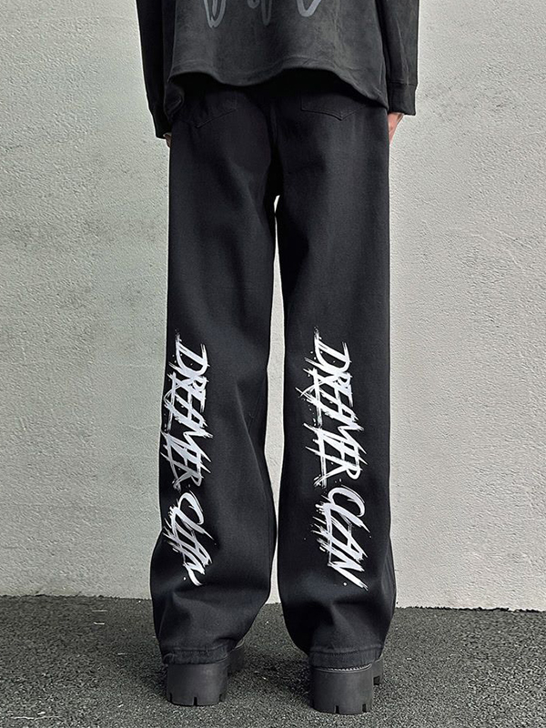 Vintage Yellow Mud Letter Loose Straight Jeans